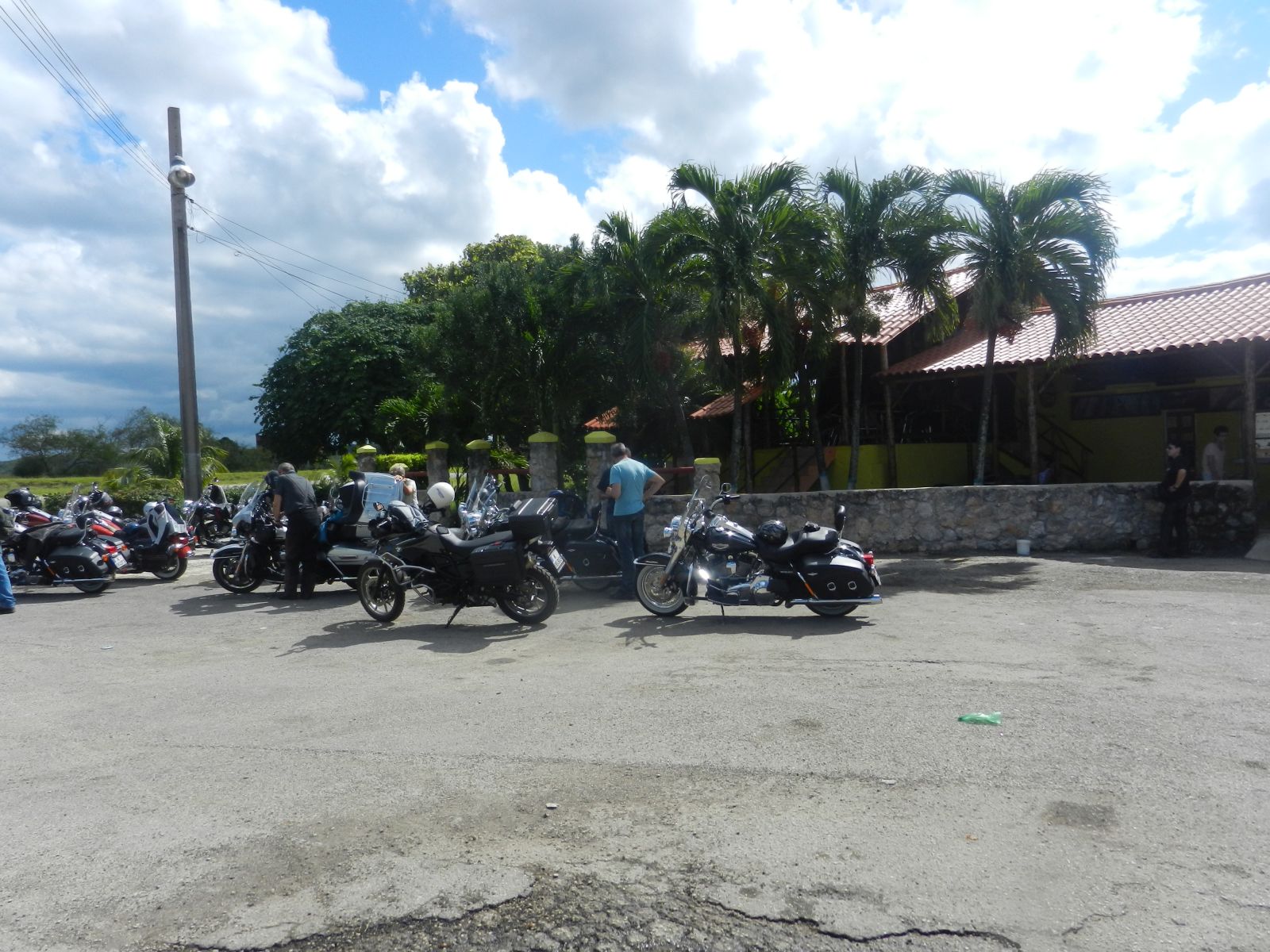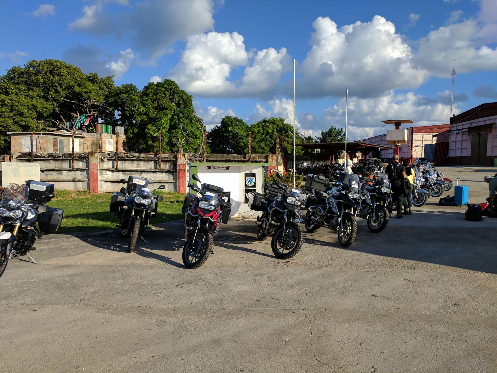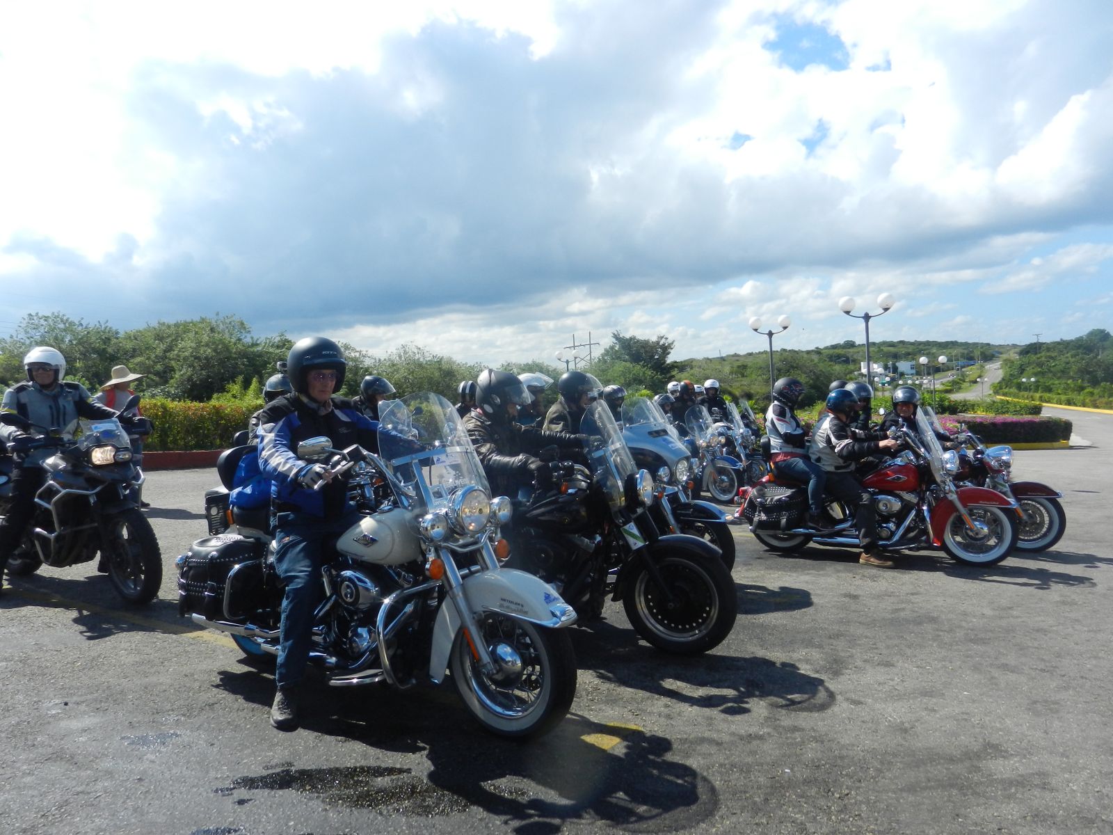 Nachdem wir alle Formalitäten und Probefahrten erledigt hatten, starteten wir im Konvoi von 19 Bikes zu unserer Rundreise. Zuerst führte uns Hanival (aka Hannibal), der Tourguide vom Vermieter, durch die Vororte auf den Malecón zurück. Vorbei an der CH-, US-Botschaft und unserem Hotel näherten wir uns der Altstadt. Für einmal waren nicht die farbigen Oldtimer die Attraktion in der Altstadt, sondern unsere dröhnenden Maschinen. Überall standen die Leute, winkten und fotografierten.