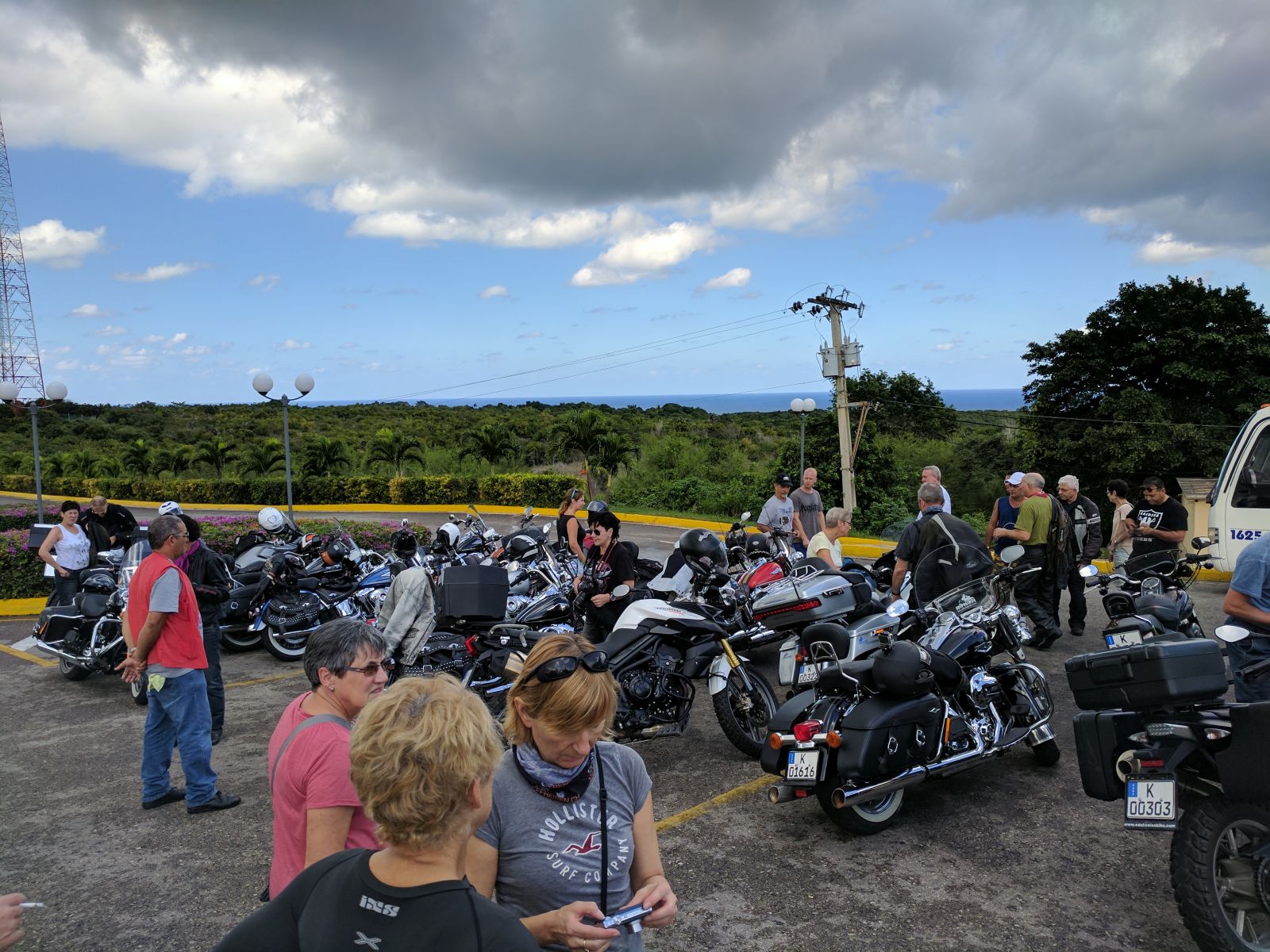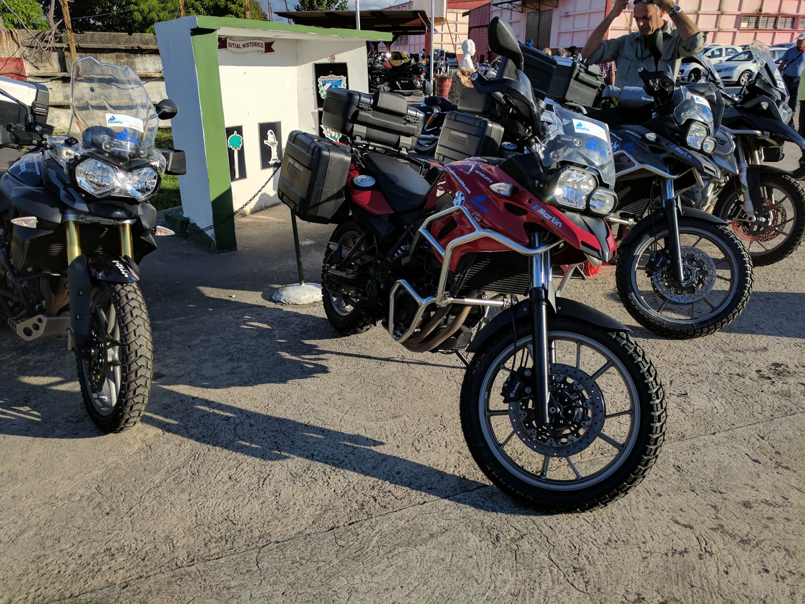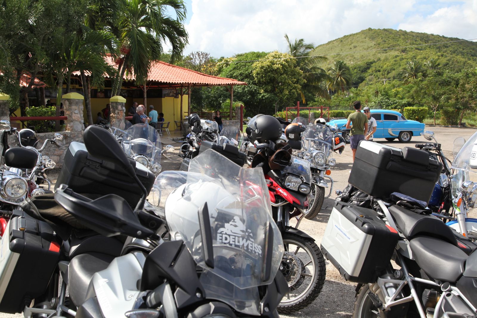 Nachdem wir alle Formalitäten und Probefahrten erledigt hatten, starteten wir im Konvoi von 19 Bikes zu unserer Rundreise. Zuerst führte uns Hanival (aka Hannibal), der Tourguide vom Vermieter, durch die Vororte auf den Malecón zurück. Vorbei an der CH-, US-Botschaft und unserem Hotel näherten wir uns der Altstadt. Für einmal waren nicht die farbigen Oldtimer die Attraktion in der Altstadt, sondern unsere dröhnenden Maschinen. Überall standen die Leute, winkten und fotografierten.