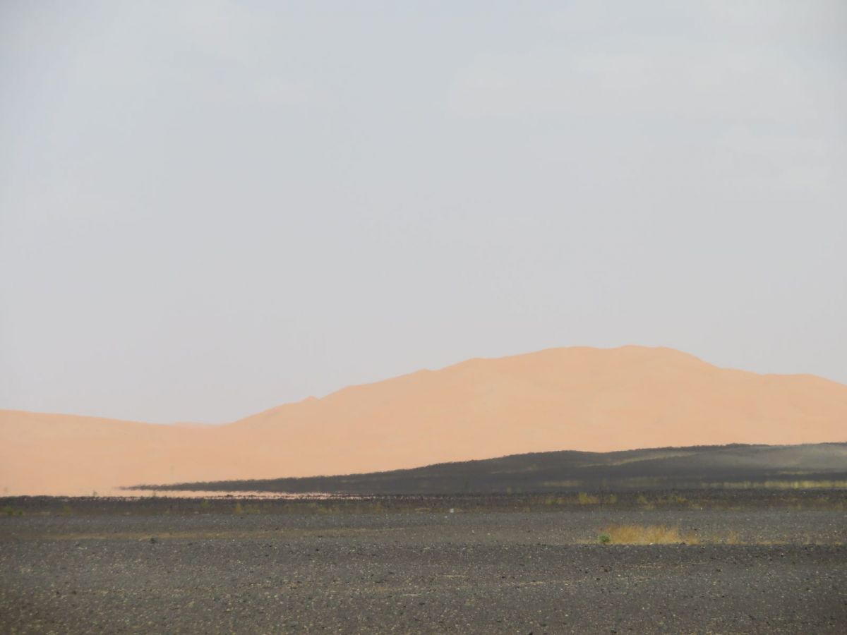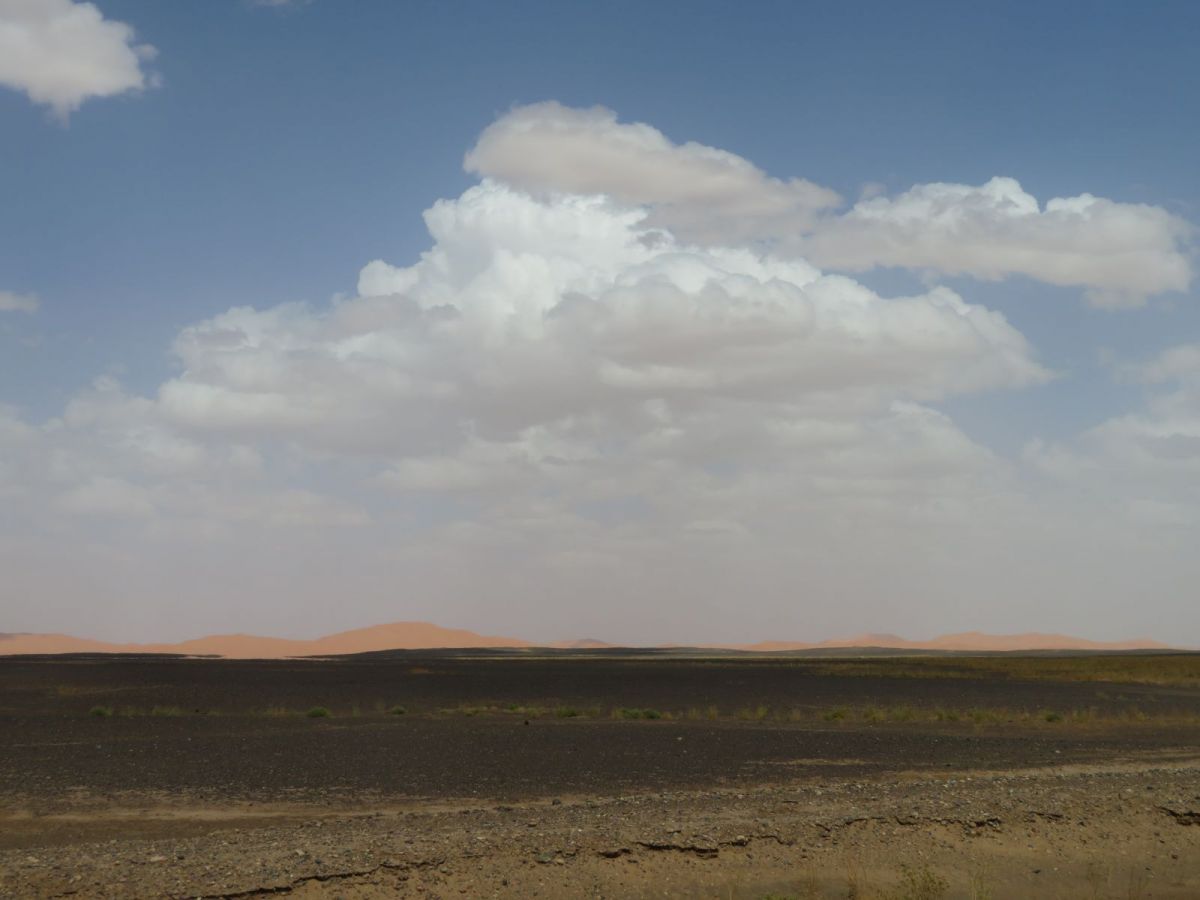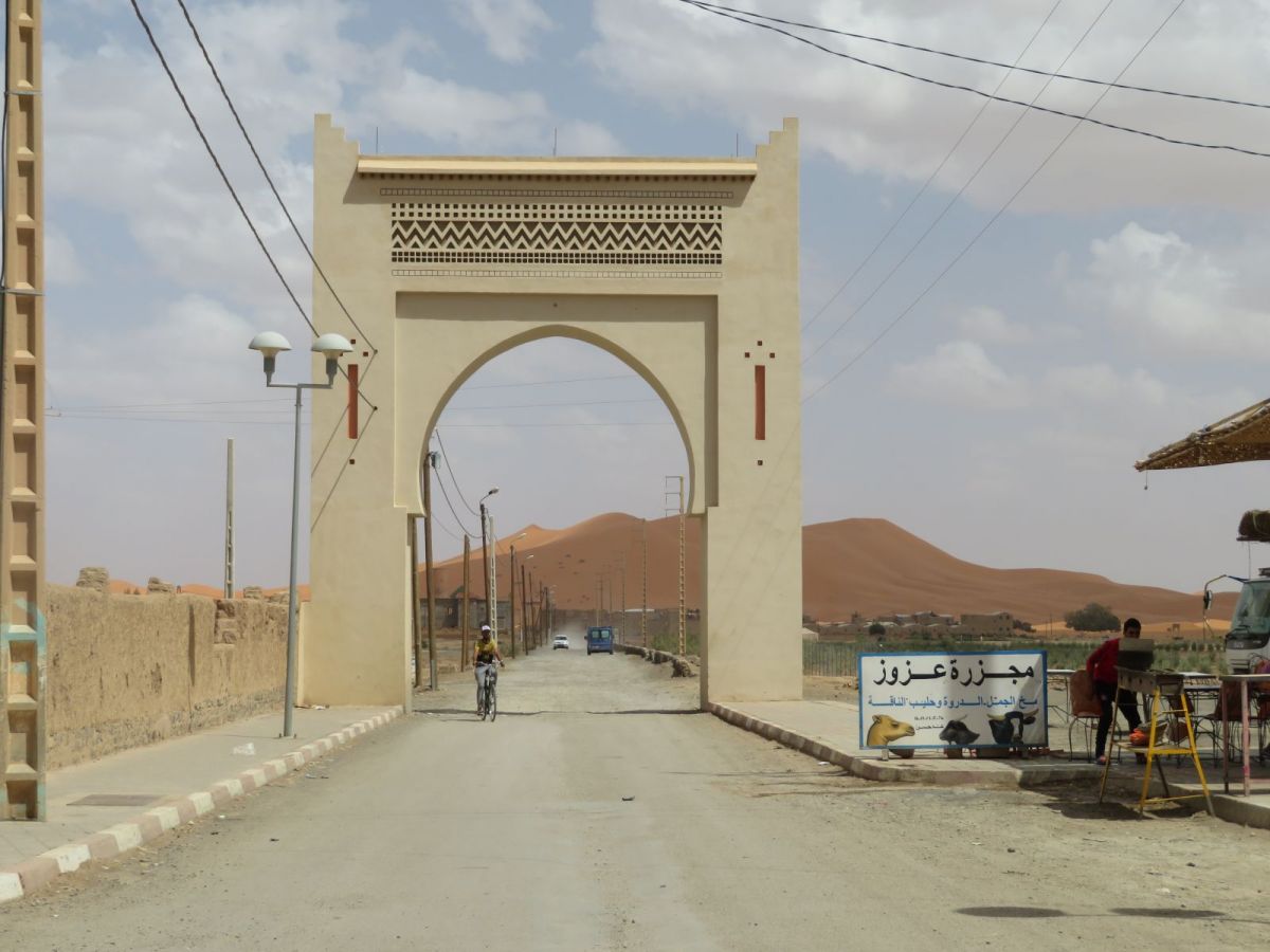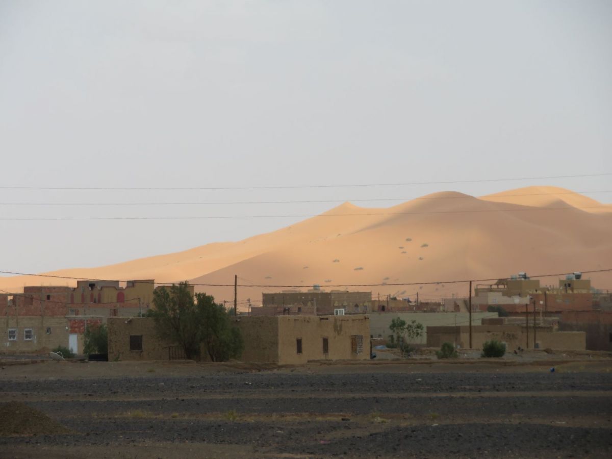 Nach dem Besuch der Schlucht fuhren wir weiter wieder in die WEüste hinein zu unserem nächsten Tagesziel, den Erg Chebbi Sanddünen bei Merzouga. Schon von weitem begrüssten uns die Dünen und wir fuhren zuerst direkt nach Merzouga. Hier war es Dank des Ramadan wie ausgestorben, nur ein paar 'faux guides' wollten uns Kamel- und andere Touren in die Dünen aufschwatzen.